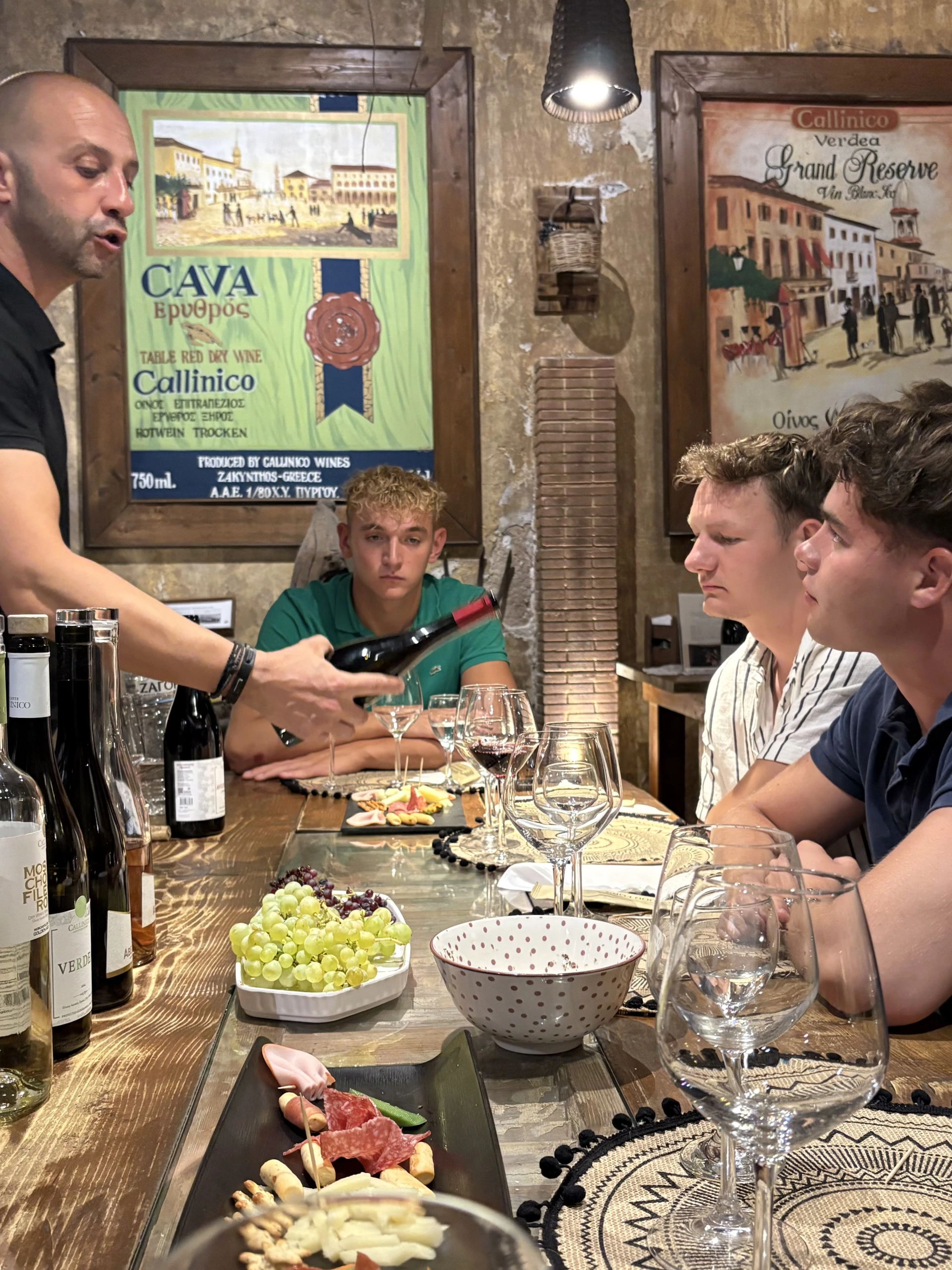 Ik ben naar Callinico gegaan tijdens mijn trip op Zakynthos, en eerlijk gezegd verwachtte ik een wat saaie excursie. Het tegendeel bleek waar. We werden ontvangen door Marios, die ons een rondleiding gaf door de winery, het museum en de kelders. Wat me direct opviel was dat hij echt gepassioneerd was over de wijn en de familiegeschiedenis, niet zo van die gestandaardiseerde tours waar je na vijf minuten afhaakt. Het museum-gedeelte is echt gaaf, je ziet oude wijnpersen, tonnen en gereedschappen uit de tijd dat alles nog met de hand ging. De aardbeving van 1953 heeft de winery destijds verwoest, en die geschiedenis maakt het verhaal extra bijzonder. Na de rondleiding gingen we zitten voor de proeverij. Ik koos voor een premium pakket met hapjes, en dat is wat mij betreft de juiste keuze. Je krijgt een selectie van hun betere wijnen, gecombineerd met lokale kazen, olijfolie, brood, cold cuts en breadsticks. Marios legt bij elke wijn uit waar hij vandaan komt, wat de druivensoort is en waar je op moet letten bij het proeven. Ik ben geen wijnkenner, maar je leert in een uur meer dan je in tien restaurants oppikt. Absolute aanrader, zeker als je wat anders wilt dan alleen strand en feesten.